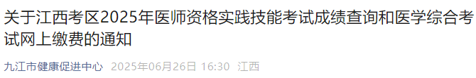 為更好服務考生、縮短考生查詢成績等待時間,根據(jù)國家醫(yī)師資格考試工作要求及我省考務工作安排,各有關考點、考試基地自6月17日起已陸續(xù)開通考試成績查詢,考生可在考試結束后48小時在所在考點或考試基地查詢。江西考區(qū)將于6月26日在國家醫(yī)學考試網開通2025年醫(yī)師資格實踐技能考試成績查詢,6月26日-7月6日將開通醫(yī)學綜合考試網上繳費。未在規(guī)定時間內完成網上繳費的考生,視為放棄報名考試,將無法打印準考證等材料,無法參加后續(xù)考試。
