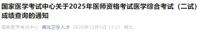 - · 湖北省2025年醫(yī)師資格(二試)成績(jī)國(guó)家醫(yī)學(xué)考試網(wǎng)已公布!