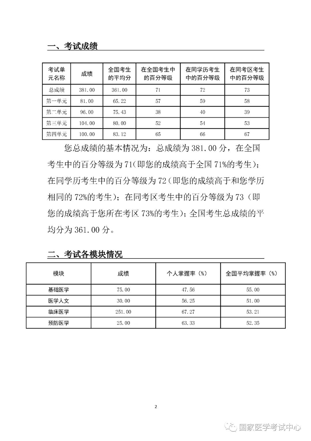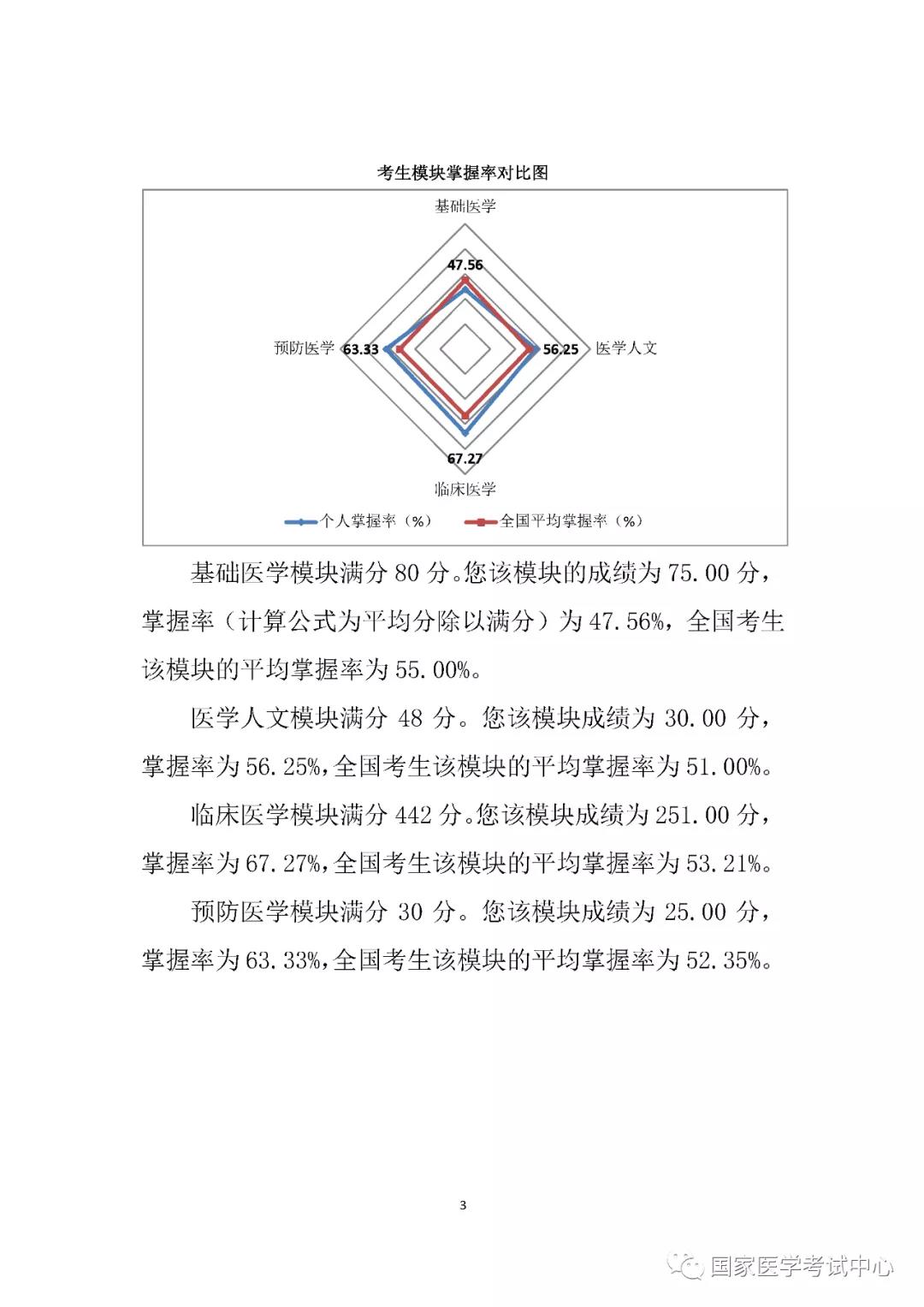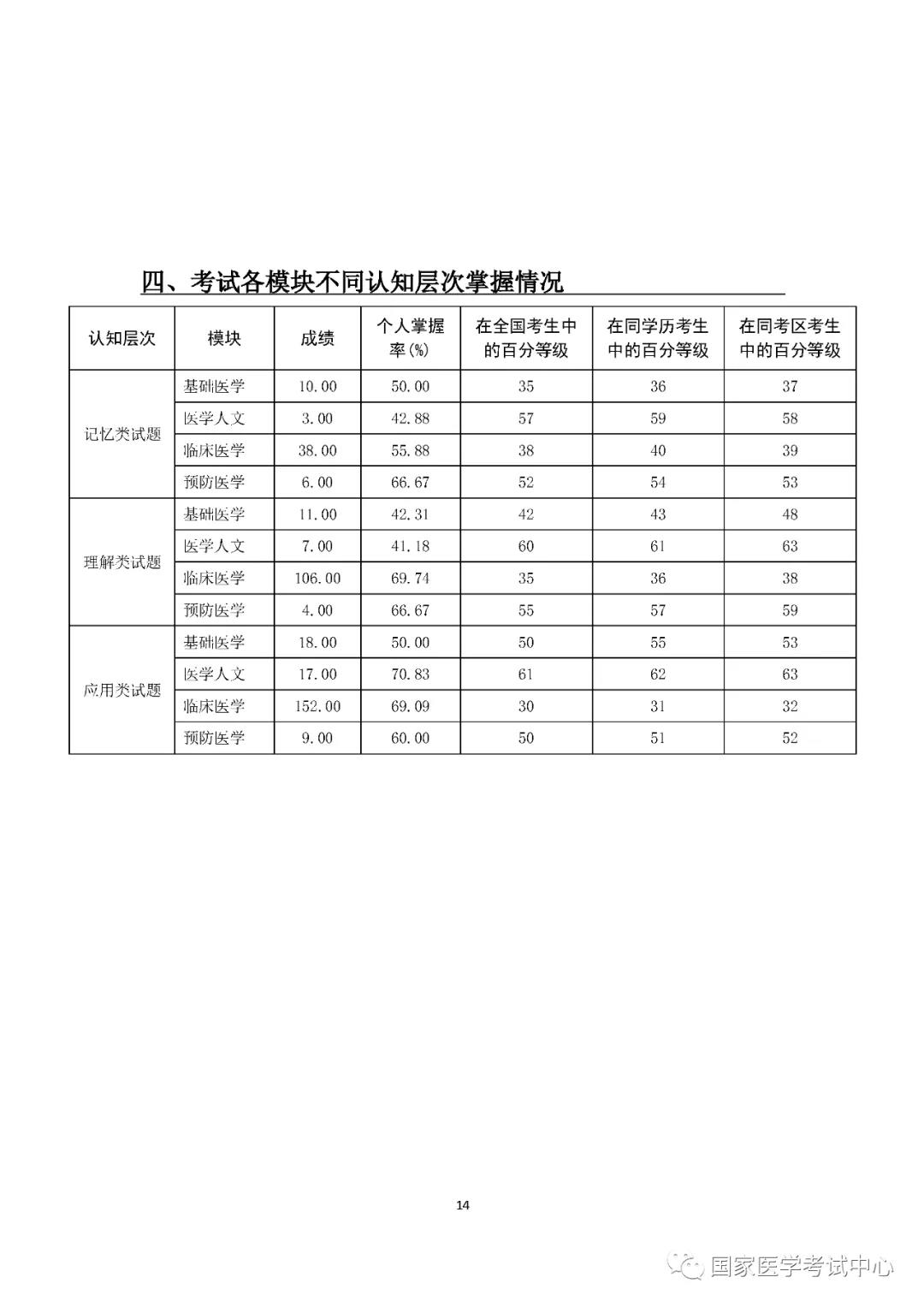 報(bào)告的內(nèi)容包括總成績(jī)、各模塊、學(xué)科及認(rèn)知層次的掌握率和百分等級(jí),樣例見附件(以臨床為例)。其中個(gè)人成績(jī)分析數(shù)據(jù)以四個(gè)單元成績(jī)?yōu)榛A(chǔ),不包括軍事醫(yī)學(xué)及短線醫(yī)學(xué)專業(yè)加試部分成績(jī)的數(shù)據(jù)分析。提供PDF版本報(bào)告的下載,方便考生隨時(shí)查看。