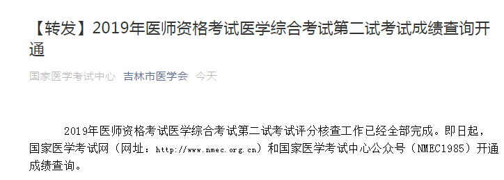 吉林考點(diǎn)2019年醫(yī)師資格考試二試查分通道已經(jīng)開通,具體通知內(nèi)容如下: