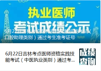 請(qǐng)參加6月22日吉林考點(diǎn)實(shí)踐技能考試口腔助理、中醫(yī)執(zhí)業(yè)類(lèi)別的考生根據(jù)準(zhǔn)考證號(hào)查詢(xún)考試通過(guò)情況,最終考試成績(jī)以國(guó)家醫(yī)學(xué)考試網(wǎng)(https://www.nmec.org.cn/)公布為準(zhǔn)!