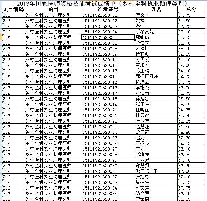 內(nèi)蒙古錫林郭勒盟2019年國(guó)家鄉(xiāng)村執(zhí)業(yè)助理實(shí)踐技能考生成績(jī)表!