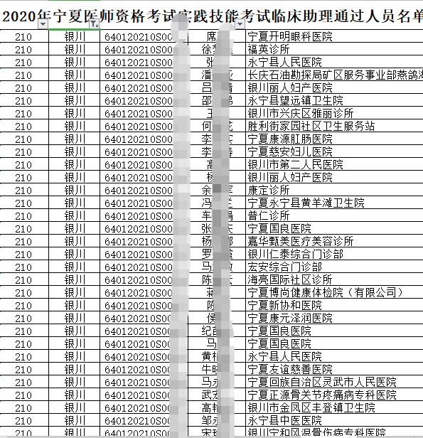 以上為部分寧夏考區(qū)2020年國家醫(yī)師資格實踐技能考試合格人員名單。完整名單信息請在寧夏醫(yī)學會官方網(wǎng)站查詢。也可以直接下載附件查看。
