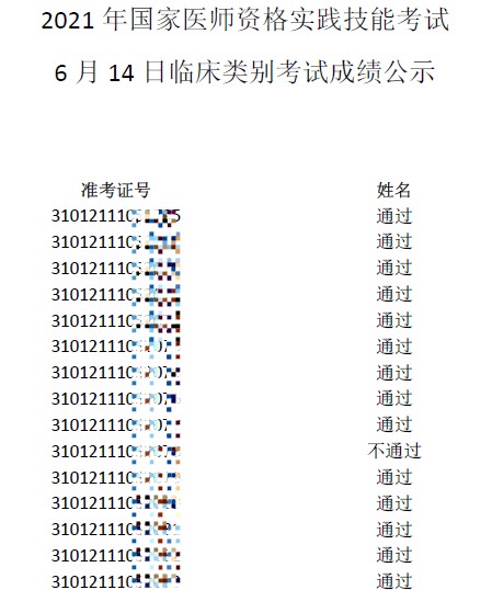 上海醫(yī)師資格考試2021年6月14日臨床類別技能考試成績(jī)公示
