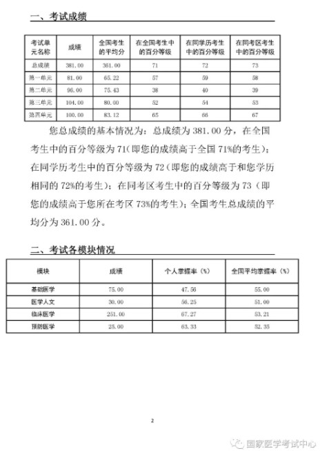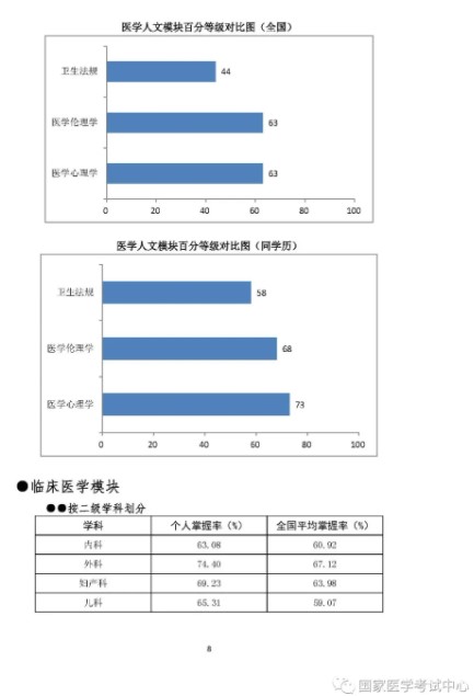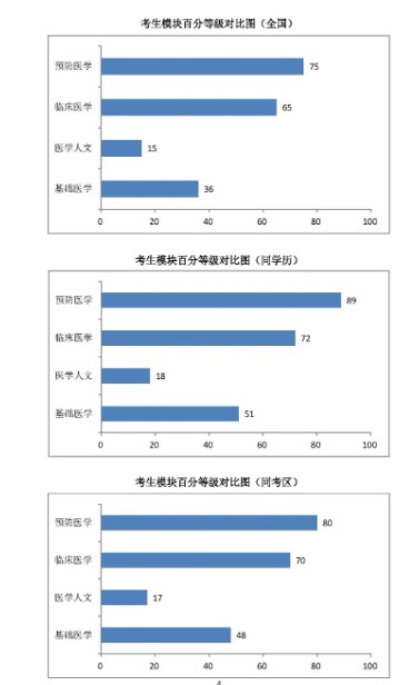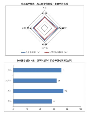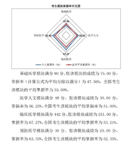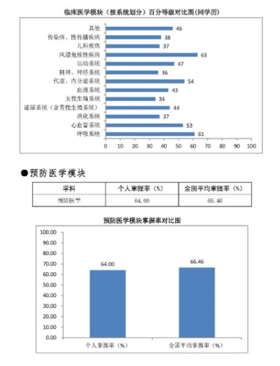 報告的內(nèi)容包括總成績、各模塊、學(xué)科及認(rèn)知層次的掌握率和百分等級,樣例見附件 (以臨床為例)。其中個人成績分析數(shù)據(jù)以四個單元成績?yōu)榛A(chǔ),不包括軍事醫(yī)學(xué)及短線醫(yī)學(xué)專業(yè)加試部分成績的數(shù)據(jù)分析。提供PDF版本報告的下載,方便考生隨時查看。