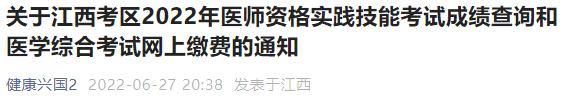 根據(jù)國(guó)家醫(yī)師資格考試工作要求及我省考務(wù)工作安排,江西考區(qū)2022年醫(yī)師資格實(shí)踐技能考試成績(jī)查詢將于6月29日開(kāi)通,醫(yī)學(xué)綜合考試網(wǎng)上繳費(fèi)將于6月29日開(kāi)放,7月7日結(jié)束。未在規(guī)定時(shí)間內(nèi)完成網(wǎng)上繳費(fèi)的考生,視為放棄報(bào)名考試,將無(wú)法打印準(zhǔn)考證等材料,無(wú)法參加后續(xù)考試。
