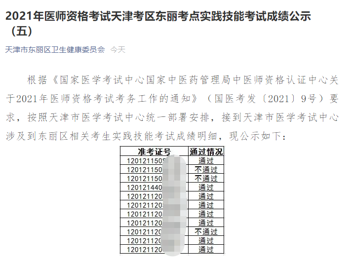 天津市東麗區(qū)發(fā)布了2021年醫(yī)師資格實踐技能考試成績公示(五),很多考生都在關注,醫(yī)學教育網小編搜集整理如下: