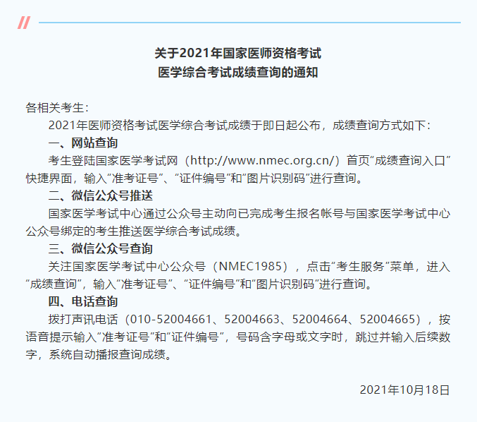 2021年醫(yī)師資格考試醫(yī)學(xué)綜合考試成績于即日起公布,成績查詢方式如下: