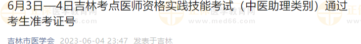 請參加6月3日-4日吉林考點實踐技能考試中醫(yī)助理類別的考生根據(jù)準(zhǔn)考證號查詢考試通過情況,最終考試成績以國家醫(yī)學(xué)考試網(wǎng)()公布為準(zhǔn)!