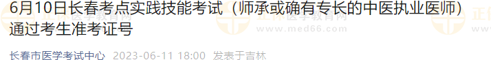 請參加6月10日長春考點(diǎn)實(shí)踐技能考試師承或確有專長的中醫(yī)執(zhí)業(yè)醫(yī)師的考生根據(jù)準(zhǔn)考證號查詢考試通過情況,最終考試成績以國家醫(yī)學(xué)考試網(wǎng)()公布為準(zhǔn)!