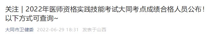 大同市2022年醫(yī)師資格實(shí)踐技能考試成績公布時(shí)間是在6月29號。成績有以下兩種途徑可以查詢: