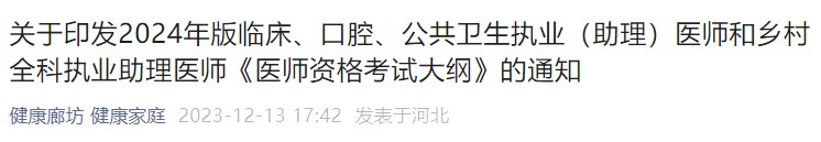 關(guān)于印發(fā)2024年版臨床、口腔、公共衛(wèi)生執(zhí)業(yè)(助理)醫(yī)師和鄉(xiāng)村全科執(zhí)業(yè)助理醫(yī)師《醫(yī)師資格考試大綱》的通知