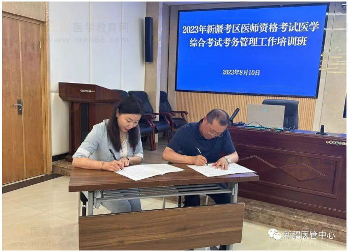 自治區(qū)衛(wèi)生健康委二級巡視員、老齡健康處處長林全藝充分肯定了2023年實踐技能考試工作的成績,對扎實做好2023年醫(yī)學綜合考試考務工作提出具體要求:一是落實安全保密制度,確??荚嚢踩?;二是執(zhí)行考務管理規(guī)程,確保考務安全;三是強化違紀違規(guī)查處,確保公平公正;四是強化考試值班值守,確??荚嚻椒€(wěn);五是強化安全應急演練,確保處置到位。隨后代表新疆考區(qū)與烏魯木齊考點負責人簽訂了《2023年全國醫(yī)師資格考試醫(yī)學綜合考試安全保密責任書》。