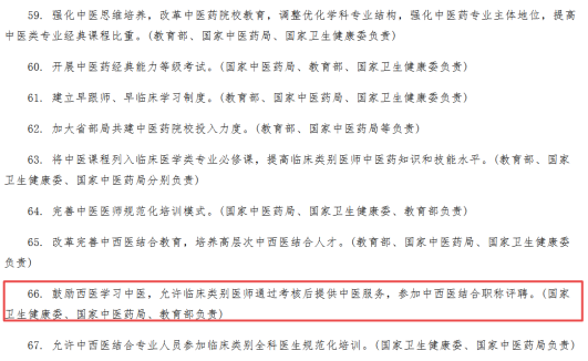 12月16日《中共中央國務(wù)院關(guān)于促進(jìn)中醫(yī)藥傳承創(chuàng)新發(fā)展的意見》重點(diǎn)任務(wù)分工方案的通知公布了,對于加強(qiáng)中醫(yī)藥人才隊(duì)伍建設(shè)提出了多項(xiàng)要求,其中在66條提到“鼓勵(lì)西醫(yī)學(xué)習(xí)中醫(yī),允許臨床類別醫(yī)師通過考核后提供中醫(yī)服務(wù),參加中西醫(yī)結(jié)合職稱評聘。