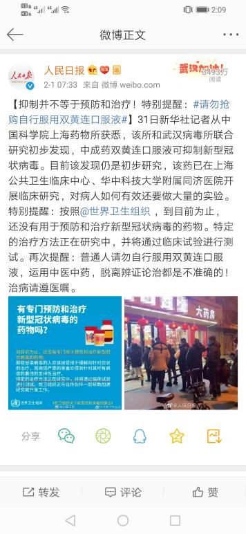 消息傳出,很多人搶購(gòu)并自行服用雙黃連口服液,至此人民日?qǐng)?bào)提醒廣大民眾: