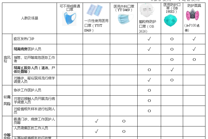在新型冠狀病毒感染的肺炎流行期間,建議選擇合適的口罩類型,不過(guò)度防護(hù)。按防疫工作性質(zhì)和風(fēng)險(xiǎn)等級(jí)提出以下指引: