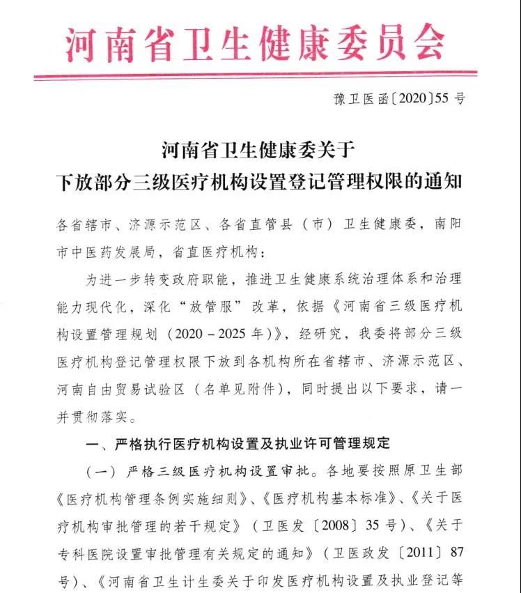 省衛(wèi)生健康委要求自即日起,新申請設(shè)置、執(zhí)業(yè)登記三級醫(yī)療機構(gòu)的審批權(quán)限由所在省轄市、省直管縣(市)、濟源示范區(qū)、河南自由貿(mào)易試驗區(qū)衛(wèi)生健康委負(fù)責(zé)。省級已經(jīng)受理的三級醫(yī)療機構(gòu)許可項目,繼續(xù)完成后續(xù)許可工作。