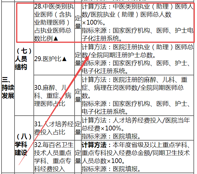 考核指標28項:中醫(yī)類別執(zhí)業(yè)醫(yī)師(含執(zhí)業(yè)助理醫(yī)師)占執(zhí)業(yè)醫(yī)師總數(shù)比例,計算方法:中醫(yī)類別執(zhí)業(yè)(助理)醫(yī)師人數(shù)/醫(yī)院執(zhí)業(yè)(助理)醫(yī)師總人數(shù)×100%。