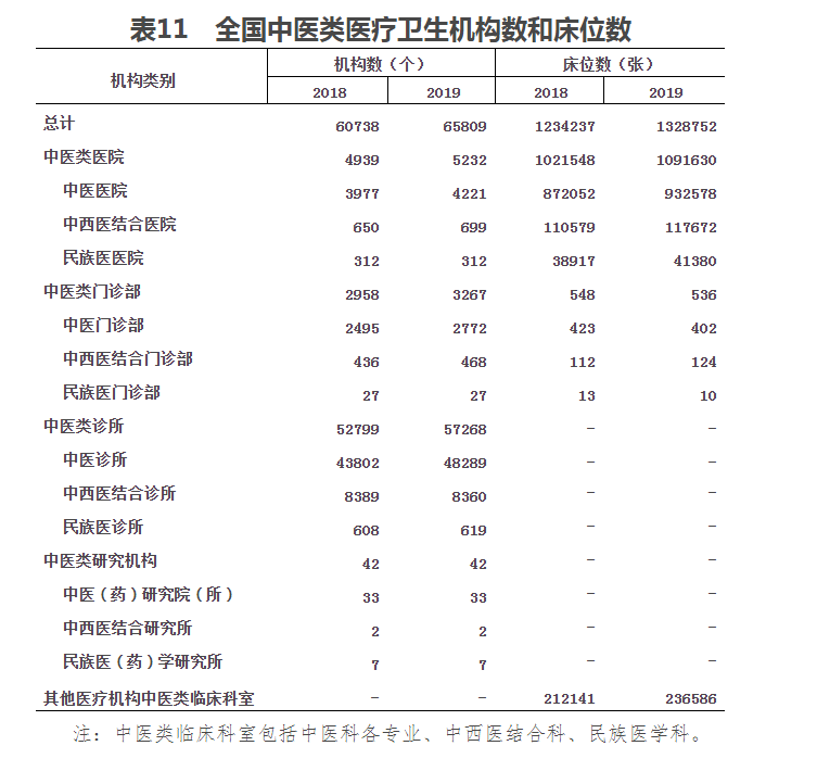 (一)中醫(yī)類機(jī)構(gòu)、床位及人員數(shù)。2019年末,全國(guó)中醫(yī)類醫(yī)療衛(wèi)生機(jī)構(gòu)總數(shù)達(dá)65809個(gè),比上年增加5071個(gè)。其中:中醫(yī)類醫(yī)院5232個(gè),中醫(yī)類門診部、診所60535個(gè),中醫(yī)類研究機(jī)構(gòu)42個(gè)。與上年比較,中醫(yī)類醫(yī)院增加293個(gè),中醫(yī)類門診部及診所增加4778個(gè)(見(jiàn)表11)。