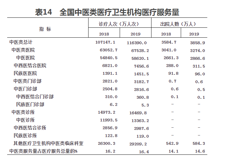 2019年,全國(guó)中醫(yī)類醫(yī)療衛(wèi)生機(jī)構(gòu)出院人數(shù)3858.9萬(wàn)人,比上年增加274.2萬(wàn)人(增長(zhǎng)7.6%)。其中:中醫(yī)類醫(yī)院3274.0萬(wàn)人(占84.8%),中醫(yī)類門診部0.6萬(wàn)人,其他醫(yī)療衛(wèi)生機(jī)構(gòu)中醫(yī)類臨床科室584.3萬(wàn)人(占15.1%)(見(jiàn)表14)。