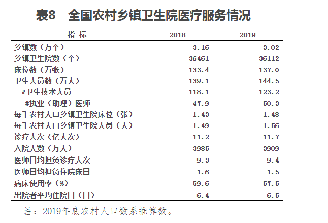 2019年底,全國(guó)3.02萬(wàn)個(gè)鄉(xiāng)鎮(zhèn)共設(shè)3.6萬(wàn)個(gè)鄉(xiāng)鎮(zhèn)衛(wèi)生院,床位137.0萬(wàn)張,衛(wèi)生人員144.5萬(wàn)人(其中衛(wèi)生技術(shù)人員123.2萬(wàn)人)。與上年比較,鄉(xiāng)鎮(zhèn)衛(wèi)生院減少349個(gè)(鄉(xiāng)鎮(zhèn)撤并后衛(wèi)生院合并),床位增加3.6萬(wàn)張,人員增加5.4萬(wàn)人。2019年,每千農(nóng)村人口鄉(xiāng)鎮(zhèn)衛(wèi)生院床位達(dá)1.48張,每千農(nóng)村人口鄉(xiāng)鎮(zhèn)衛(wèi)生院人員達(dá)1.56人(見(jiàn)表8)。