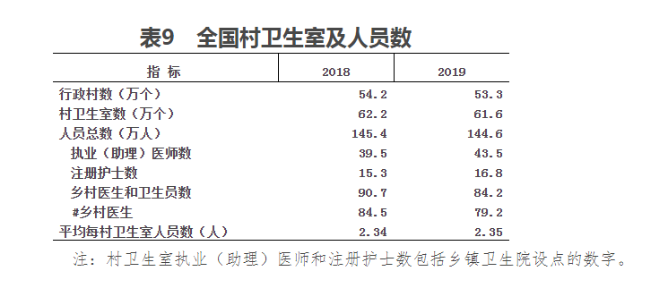 2019年底,全國(guó)53.3萬(wàn)個(gè)行政村共設(shè)61.6萬(wàn)個(gè)村衛(wèi)生室。村衛(wèi)生室人員達(dá)144.6萬(wàn)人,其中:執(zhí)業(yè)(助理)醫(yī)師43.5萬(wàn)人、注冊(cè)護(hù)士16.8萬(wàn)人、鄉(xiāng)村醫(yī)生和衛(wèi)生員84.2萬(wàn)人。平均每村衛(wèi)生室人員2.35人。與上年比較,村衛(wèi)生室數(shù)減少0.6萬(wàn)個(gè),人員總數(shù)有所減少(見(jiàn)表9)。