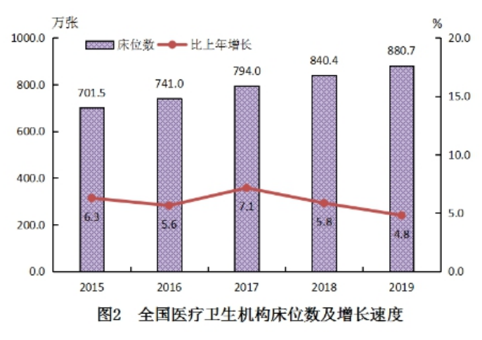 (二)床位數(shù)。2019年末,全國(guó)醫(yī)療衛(wèi)生機(jī)構(gòu)床位880.7萬(wàn)張,其中:醫(yī)院686.7萬(wàn)張(占78.0%),基層醫(yī)療衛(wèi)生機(jī)構(gòu)163.1萬(wàn)張(占18.5%),專業(yè)公共衛(wèi)生機(jī)構(gòu)28.5萬(wàn)張(占3.2%)。醫(yī)院中,公立醫(yī)院床位占72.5%,民營(yíng)醫(yī)院床位占27.5%。與上年比較,床位增加40.3萬(wàn)張,其中:醫(yī)院床位增加34.7萬(wàn)張(公立醫(yī)院增加17.4萬(wàn)張,民營(yíng)醫(yī)院增加17.3萬(wàn)張),基層醫(yī)療衛(wèi)生機(jī)構(gòu)床位增加4.8萬(wàn)張,專業(yè)公共衛(wèi)生機(jī)構(gòu)床位增加1.1萬(wàn)張。每千人口醫(yī)療衛(wèi)生機(jī)構(gòu)床位數(shù)由2018年6.03張?jiān)黾拥?019年6.30張。