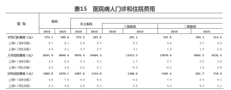 (一)醫(yī)院病人醫(yī)藥費用。2019年,醫(yī)院次均門診費用290.8元,按當年價格比上年上漲6.1%,按可比價格上漲3.1%;人均住院費用9848.4元,按當年價格比上年上漲6.0%,按可比價格上漲3.0%。日均住院費用1079.1元(見表15)。