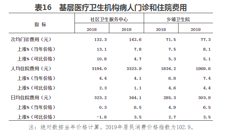 (二)基層醫(yī)療衛(wèi)生機構病人醫(yī)藥費用。2019年,社區(qū)衛(wèi)生服務中心次均門診費用142.6元,按當年價格比上年上漲7.8%,按可比價格上漲4.7%;人均住院費用3323.9元,按當年價格比上年上漲4.1%,按可比價格上漲1.1%(見表16)。