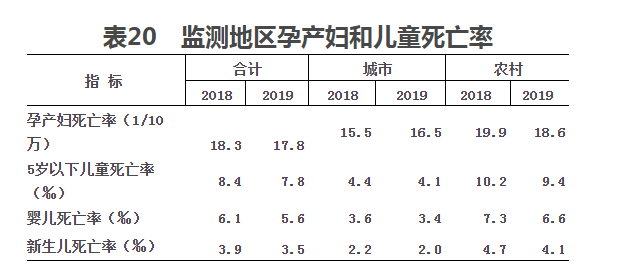 (二)5歲以下兒童死亡率。據(jù)婦幼衛(wèi)生監(jiān)測,2019年,5歲以下兒童死亡率7.8‰,其中:城市4.1‰,農(nóng)村9.4‰;嬰兒死亡率5.6‰,其中:城市3.4‰,農(nóng)村6.6‰。與上年相比,5歲以下兒童死亡率、嬰兒死亡率均有不同程度的下降(見表20)。