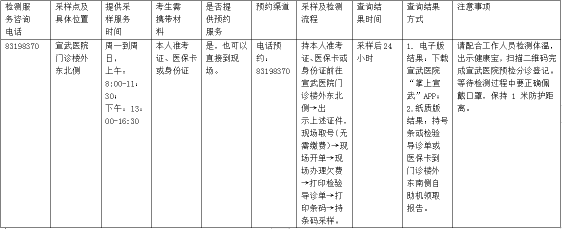 | 83198370 | 宣武醫(yī)院門診樓外東北側(cè) | 周一到周日, 上午: 8:00-11: 30; 下午:13: 00-16:30 | 本人準(zhǔn)考證、醫(yī)??ɑ蛏矸葑C | 是,也可以直接到現(xiàn)場(chǎng)。 | 電話預(yù)約:83198370 | 持本人準(zhǔn)考證、醫(yī)保卡或身份證前往宣武醫(yī)院門診樓外東北側(cè)→出 示上述證件,現(xiàn)場(chǎng)取號(hào)(無需繳費(fèi))→現(xiàn)場(chǎng)開單→現(xiàn)場(chǎng)辦理欠費(fèi)→打印檢驗(yàn)導(dǎo)診單→打印條碼→持條碼采樣。 | 采樣后24小時(shí) | 1.電子版結(jié)果:下載宣武醫(yī)院“掌上宣武”APP; 2.紙質(zhì)版結(jié)果:持號(hào)條或檢驗(yàn)導(dǎo)診單或醫(yī)??ǖ介T診樓外東南側(cè)自助機(jī)領(lǐng)取報(bào)告。 | 請(qǐng)配合工作人員檢測(cè)體溫,出示健康寶,掃描二維碼完成宣武醫(yī)院預(yù)檢分診登記。等待檢測(cè)過程中要正確佩戴口罩,保持 1 米防護(hù)距離。 |