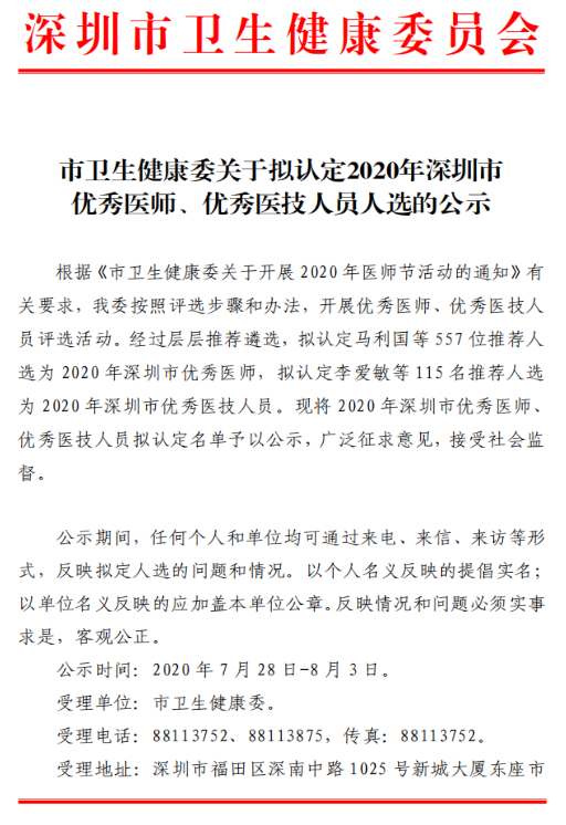 關(guān)于擬認(rèn)定2020年深圳市優(yōu)秀醫(yī)師、優(yōu)秀醫(yī)技人員人選的公示