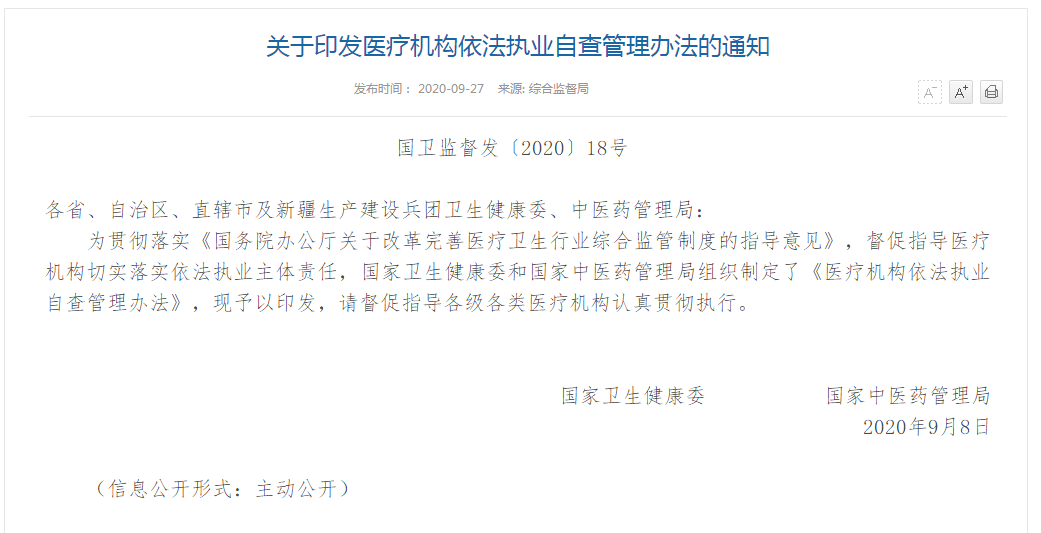 國(guó)家衛(wèi)生健康委、?國(guó)家中醫(yī)藥管理局發(fā)布了關(guān)于醫(yī)療機(jī)構(gòu)依法執(zhí)業(yè)自查管理辦法,全文如下: