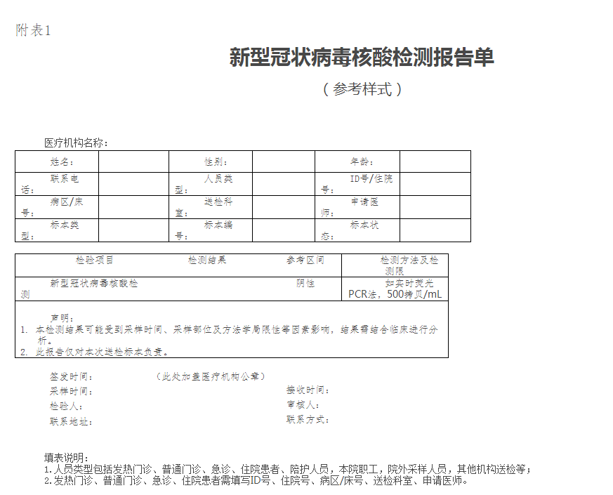 (二)檢測(cè)報(bào)告。各醫(yī)療機(jī)構(gòu)應(yīng)當(dāng)按照《新型冠狀病毒核酸檢測(cè)報(bào)告單》的參考樣式出具檢測(cè)報(bào)告(見附件1),在衛(wèi)生健康行政部門的規(guī)定下,互認(rèn)檢測(cè)結(jié)果。醫(yī)療機(jī)構(gòu)可采用紙質(zhì)、快遞、網(wǎng)絡(luò)或信息化系統(tǒng)等多種形式,發(fā)放核酸檢測(cè)報(bào)告,并注意保護(hù)個(gè)人隱私。發(fā)現(xiàn)核酸檢測(cè)陽性結(jié)果時(shí)應(yīng)按相關(guān)要求在12小時(shí)內(nèi)報(bào)告。
