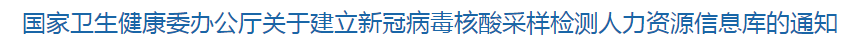 國家衛(wèi)生健康委辦公廳關(guān)于建立新冠病毒核酸采樣檢測人力資源信息庫的通知: