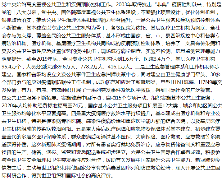 (二)關(guān)于建立突發(fā)公共衛(wèi)生事件處置聯(lián)防聯(lián)控長效機(jī)制。近年來,我國公共衛(wèi)生應(yīng)急“一案三制”(應(yīng)急預(yù)案和應(yīng)急管理體制、機(jī)制、法制)逐步完善,部門間、軍地間、區(qū)域間、國際間的信息溝通和協(xié)同聯(lián)動不斷強(qiáng)化。特別是在抗擊新冠肺炎疫情中,習(xí)近平總書記親自指揮、親自部署,多次主持中央政治局常委會會議研究部署疫情防控重大決策,黨中央成立中央應(yīng)對疫情工作領(lǐng)導(dǎo)小組,發(fā)揮統(tǒng)籌全局的作用。在習(xí)近平總書記和黨中央堅強(qiáng)領(lǐng)導(dǎo)下,各地紛紛成立由黨委政府主要負(fù)責(zé)同志任組長、多部門參與的應(yīng)對疫情工作組,團(tuán)結(jié)帶領(lǐng)人民群眾筑起聯(lián)防聯(lián)控、群防群控的嚴(yán)密防線,迅速阻斷遏制了疫情蔓延擴(kuò)散。我們將認(rèn)真總結(jié)此次抗擊新冠肺炎疫情的經(jīng)驗教訓(xùn),深入研究完善突發(fā)公共衛(wèi)生事件處置聯(lián)防聯(lián)控機(jī)制,指導(dǎo)各地進(jìn)一步健全相關(guān)機(jī)構(gòu),明確職能分工,構(gòu)建集中統(tǒng)一高效的領(lǐng)導(dǎo)指揮體系和系統(tǒng)有序、條塊暢達(dá)、執(zhí)行有力的工作推進(jìn)機(jī)制,為有效應(yīng)對疫情和突發(fā)公共衛(wèi)生事件提供堅強(qiáng)的組織領(lǐng)導(dǎo)保障。