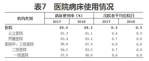 (三)病床使用。2018年,全國醫(yī)院病床使用率84.2%,其中:公立醫(yī)院91.1%。與上年比較,醫(yī)院病床使用率下降0.8個百分點(其中公立醫(yī)院下降0.2個百分點)。2018年醫(yī)院出院者平均住院日為9.3日(其中:公立醫(yī)院9.3日),醫(yī)院出院者平均住院日與上年持平(見表7)。