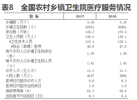 2018年底,全國3.16萬個鄉(xiāng)鎮(zhèn)共設(shè)3.6萬個鄉(xiāng)鎮(zhèn)衛(wèi)生院,床位133.4萬張,衛(wèi)生人員139.1萬人(其中衛(wèi)生技術(shù)人員118.1萬人)。與上年比較,鄉(xiāng)鎮(zhèn)衛(wèi)生院減少90個(鄉(xiāng)鎮(zhèn)撤并后衛(wèi)生院合并),床位增加4.2萬張,人員增加3.1萬人。2018年,每千農(nóng)村人口鄉(xiāng)鎮(zhèn)衛(wèi)生院床位達1.39張,每千農(nóng)村人口鄉(xiāng)鎮(zhèn)衛(wèi)生院人員達1.45人(見表8)。