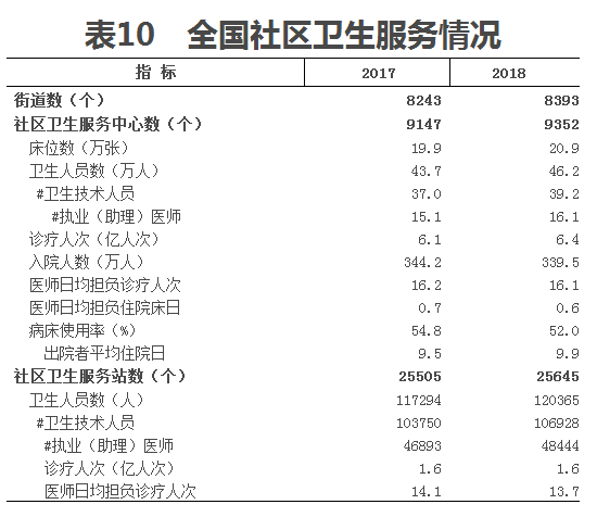 2018年,全國社區(qū)衛(wèi)生服務(wù)中心診療人次6.4億人次,入院人數(shù)339.5萬人,診療人次比上年增加;平均每個中心年診療量6.8萬人次,年入院量363人;醫(yī)師日均擔負診療16.1人次和住院0.6日。2018年,全國社區(qū)衛(wèi)生服務(wù)站診療人次1.6億人次,平均每站年診療量6244人次,醫(yī)師日均擔負診療13.7人次(見表10)。
