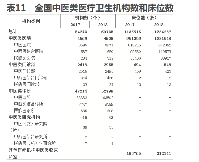 (一)中醫(yī)類機構(gòu)、床位及人員數(shù)。2018年末,全國中醫(yī)類醫(yī)療衛(wèi)生機構(gòu)總數(shù)達60738個,比上年增加6495個。其中:中醫(yī)類醫(yī)院4939個,中醫(yī)類門診部、診所55757個,中醫(yī)類研究機構(gòu)42個。與上年比較,中醫(yī)類醫(yī)院增加373個,中醫(yī)類門診部及診所增加6125個(見表11)。