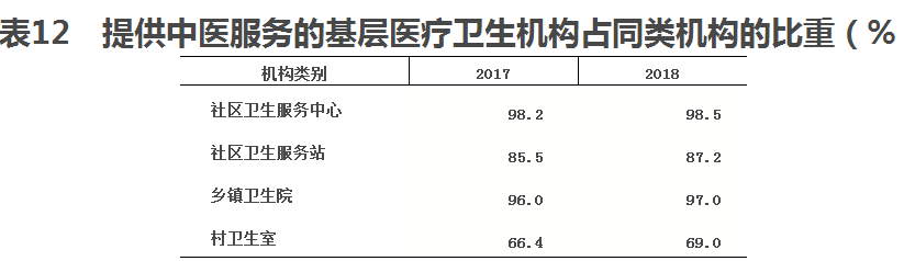 2018年末,提供中醫(yī)服務(wù)的社區(qū)衛(wèi)生服務(wù)中心占同類機構(gòu)的98.5%,社區(qū)衛(wèi)生服務(wù)站占87.2%,鄉(xiāng)鎮(zhèn)衛(wèi)生院占97.0%,村衛(wèi)生室占69.0%(見表12)。