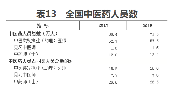 2018年末,全國中醫(yī)藥衛(wèi)生人員總數(shù)達71.5萬人,比上年增加5.1萬人(增長7.7%)。其中:中醫(yī)類別執(zhí)業(yè)(助理)醫(yī)師57.5萬人,中藥師(士)12.4萬人。兩類人員較上年有所增加(見表13)。