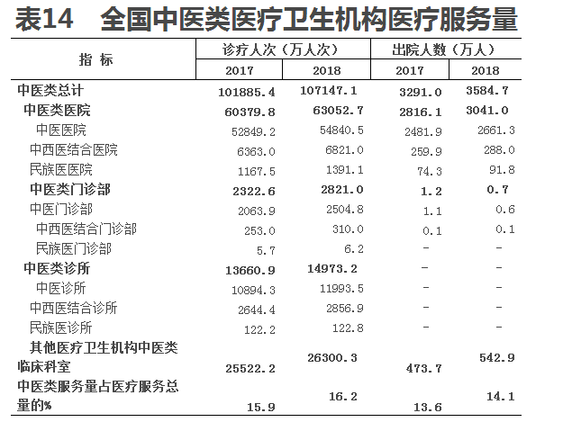 (二)中醫(yī)醫(yī)療服務(wù)。2018年,全國中醫(yī)類醫(yī)療衛(wèi)生機構(gòu)總診療人次達10.7億人次,比上年增加0.5億人次(增長5.2%)。其中:中醫(yī)類醫(yī)院6.3億人次(占58.8%),中醫(yī)類門診部及診所1.8億人次(占16.6%),其他醫(yī)療機構(gòu)中醫(yī)類臨床科室2.6億人次(占24.5%)。