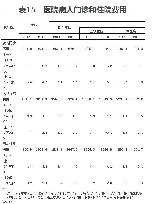 (一)醫(yī)院病人醫(yī)藥費用。2018年,醫(yī)院次均門診費用274.1元,按當年價格比上年上漲6.7%,按可比價格上漲4.5%;人均住院費用9291.9元,按當年價格比上年上漲4.5%,按可比價格上漲2.4%。日均住院費用1002.8元(見表15)。