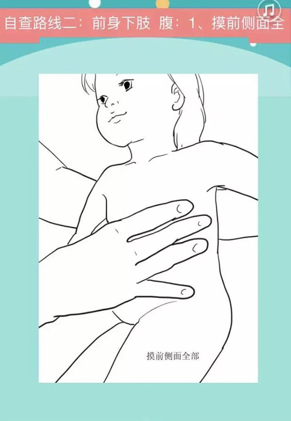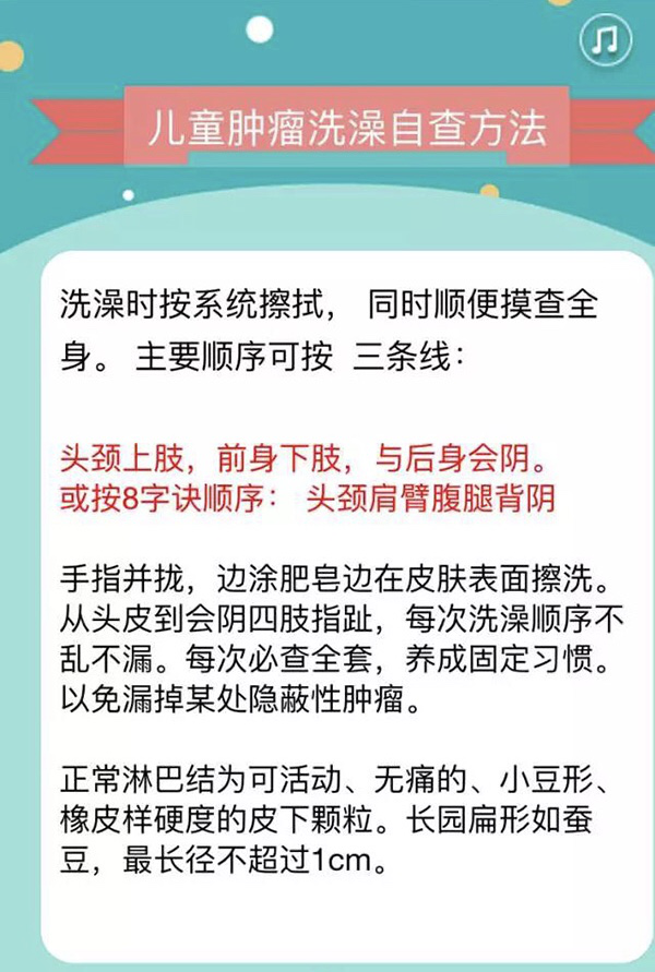 兒童腫瘤洗澡自查方法:洗澡時(shí)按部位擦拭,同時(shí)順便摸查全身。主要順序可按三條線:頭頸上肢,前身下肢,后身會(huì)陰?;虬窗俗衷E的順序:頭頸肩臂腹腿背陰。家長的手指并攏,邊涂肥皂邊在孩子的皮膚表面觸摸。從頭部到會(huì)陰、四肢、指、趾,每次洗澡順序不亂不漏。每次必查全套,養(yǎng)成固定習(xí)慣,以免漏掉某處隱蔽性腫瘤,既洗得干凈,又摸得全面。正常淋巴結(jié)為可活動(dòng)、無痛的、小豆形、不堅(jiān)硬的皮下顆粒,長圓扁形如蠶豆,最長徑一般不超過1厘米。