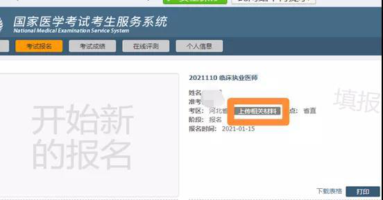 考生按常規(guī)報(bào)名流程進(jìn)入國家醫(yī)學(xué)考試考生系統(tǒng),查看自己的報(bào)名信息,在報(bào)名信息處,點(diǎn)擊“上傳相關(guān)材料”按鈕,按頁面提示進(jìn)入報(bào)名材料上傳界面。