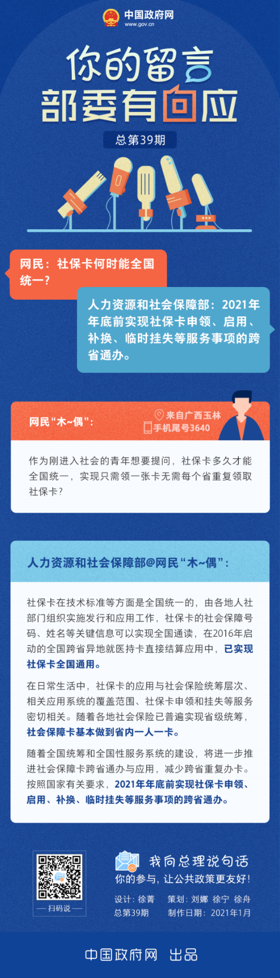 人力資源和社會保障部答網(wǎng)民關(guān)于“社保卡何時(shí)全國統(tǒng)一”的留言