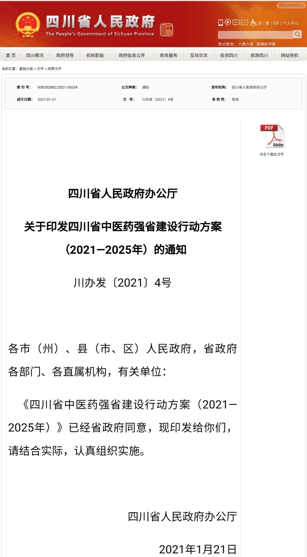 1月21日,省政府辦公廳出臺《四川省中醫(yī)藥強省建設行動方案(2021—2025年)》,全面推進新時代中醫(yī)藥強省建設。