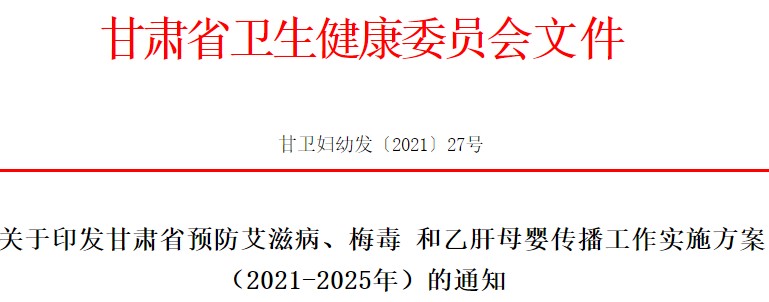 關(guān)于印發(fā)甘肅省預(yù)防艾滋病、梅毒 和乙肝母嬰傳播工作實(shí)施方案 (2021-2025年)的通知