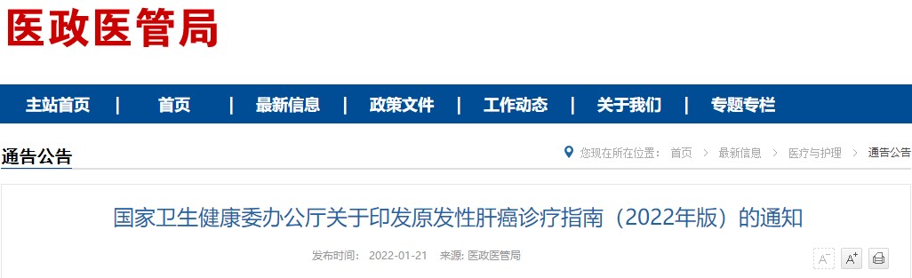 為進一步提高原發(fā)性肝癌診療規(guī)范化水平,保障醫(yī)療質(zhì)量安全,維護患者健康權(quán)益,我委組織對《原發(fā)性肝癌診療規(guī)范(2019年版)》進行了修訂,形成了《原發(fā)性肝癌診療指南(2022年版)》。現(xiàn)印發(fā)給你們(可在國家衛(wèi)生健康委網(wǎng)站醫(yī)政醫(yī)管欄目下載),請各地衛(wèi)生健康行政部門組織做好實施。